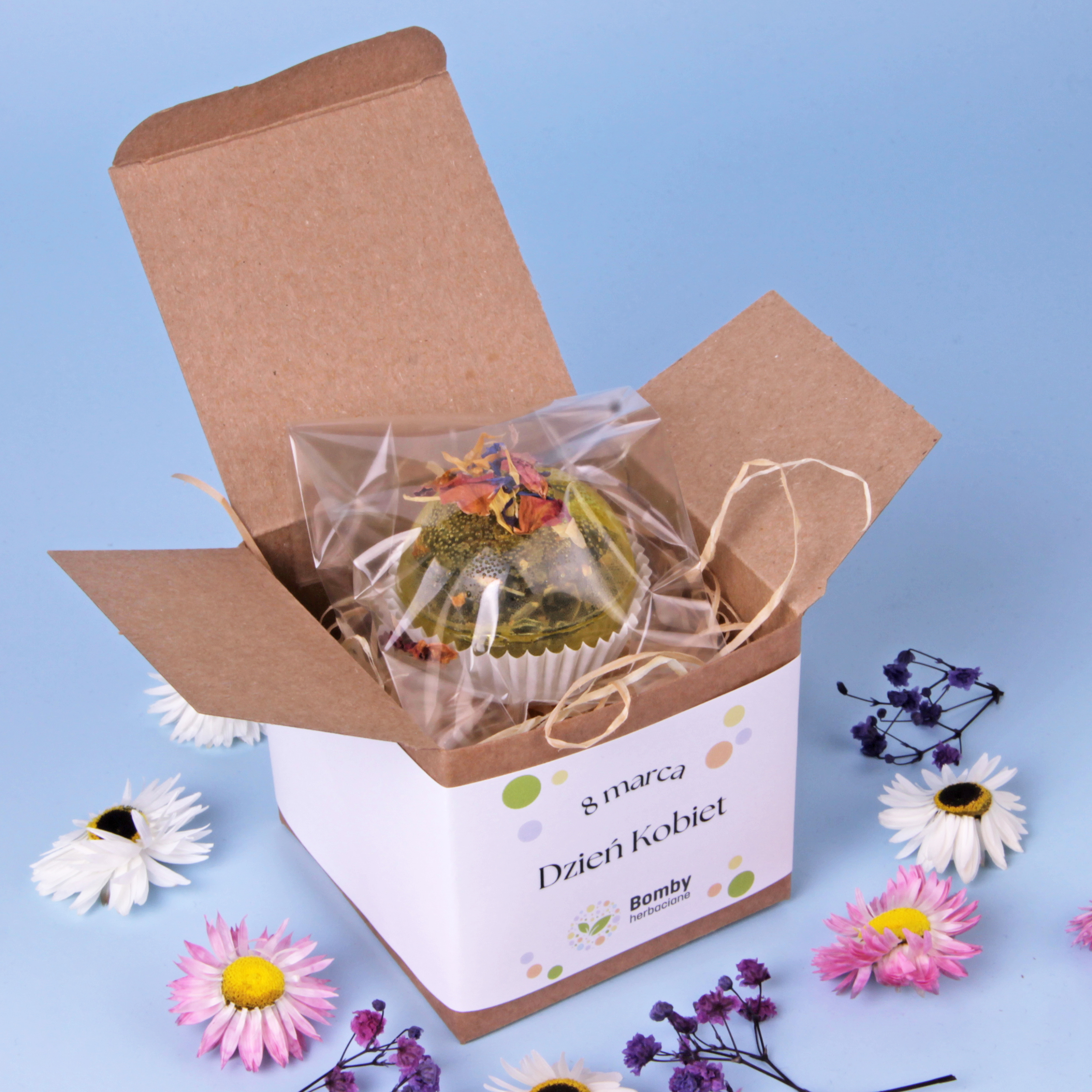 Ručně vyráběná čajová bomba zabalená v elegantní krabičce, vytvořená s ohledem na Den žen.