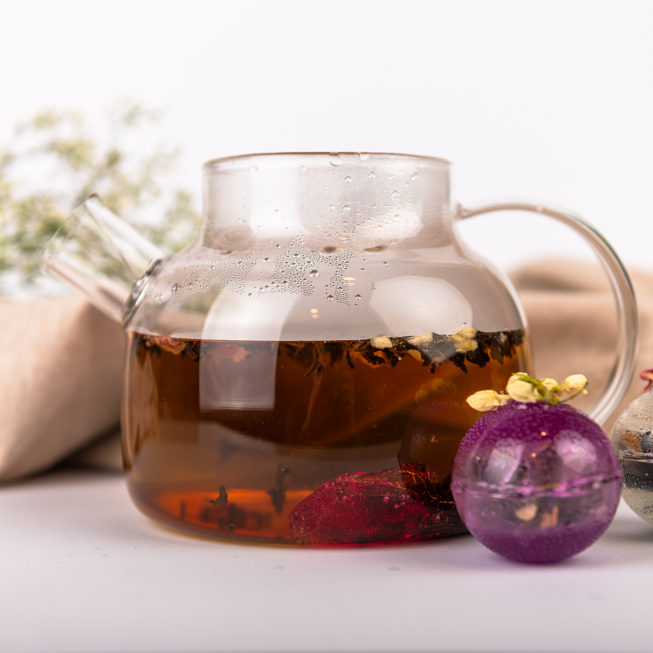 Složení: Kulička: isomalt, potravinářské barvivo. Čaj: argentinský OPA, hřebíček, malinový list, mandle, okvětní lístky růží, pomerančová kůra, aroma