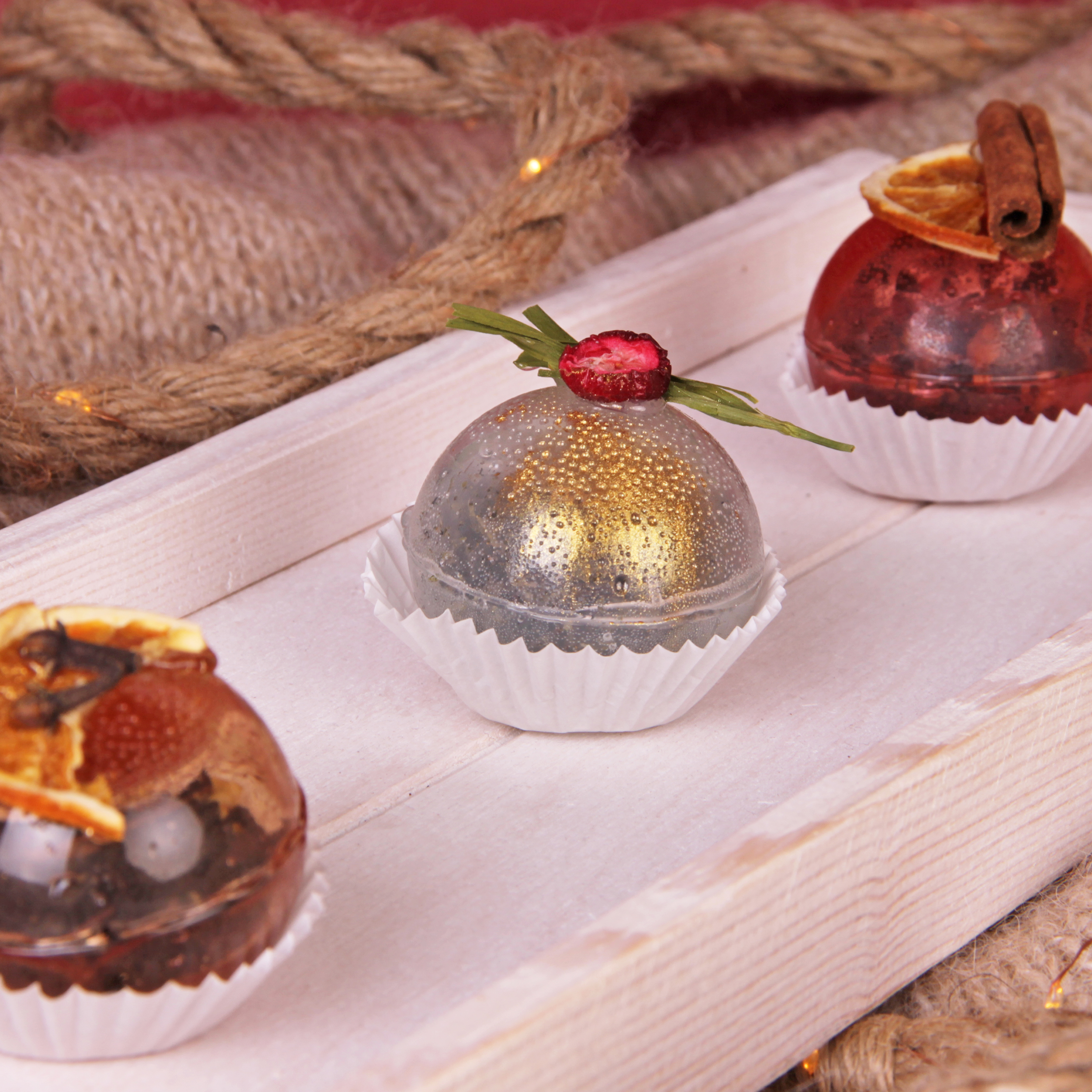 Koule je ozdobena skořicovou tyčinkou a sušeným pomerančem (dekoraci lze změnit, pokud nejsou ingredience k dispozici). Celek je doplněn zlatým jedlým prachem. Slavnostní atmosféra ideální jako dárek pro blízkou osobu.